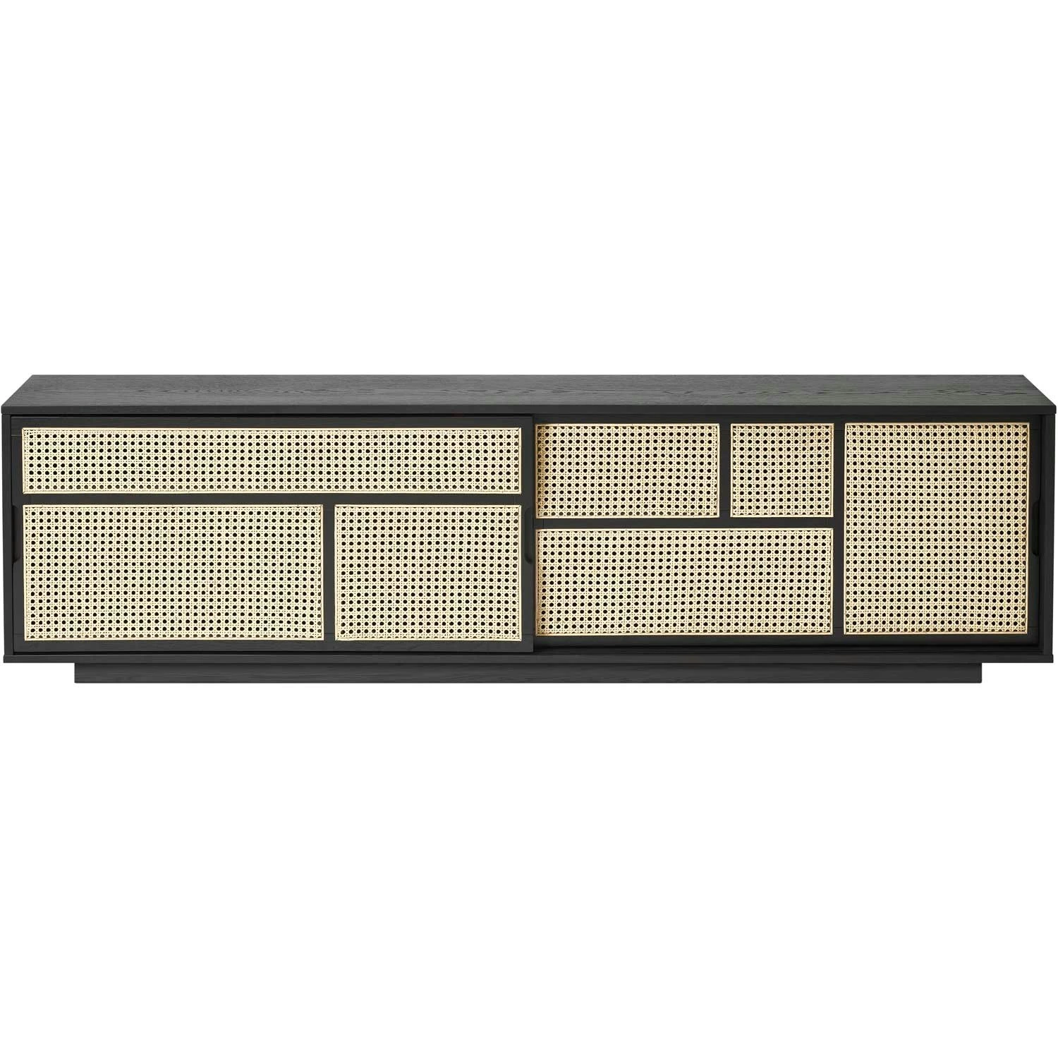 Het lage dressoir Air van Design House Stockholm is ontworpen door Mathieu Gustafsson, en past perfect als tv-meubel. De houten ribben op de schuifdeuren zorgen voor een grafisch patroon, dat een mooie aanvulling vormt op het lichte en transparante riet.