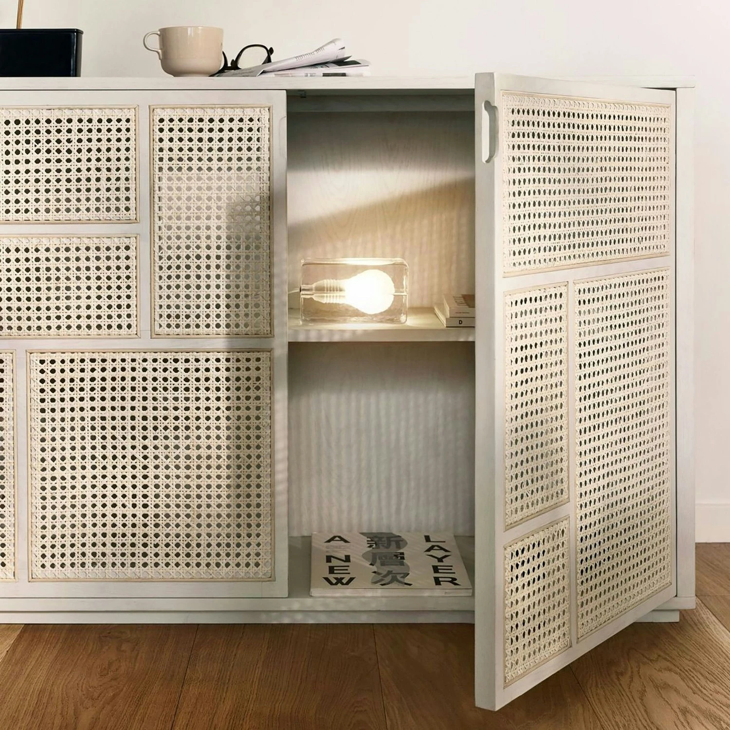 Het geweven riet geeft het een zichtbaar oppervlak, maar geeft ook een gevoel van diepte. Je kunt een glimp opvangen van wat er in zit, door wat zorgvuldig mysterie aan het stuk toe te voegen. Ook het feit dat het design transparant is, vervult een functie. Het geweven riet ventileert de kast, wat handig is bij het opbergen van zowel kleding als elektronische apparaten. Verkrijgbaar in 3 kleuren.