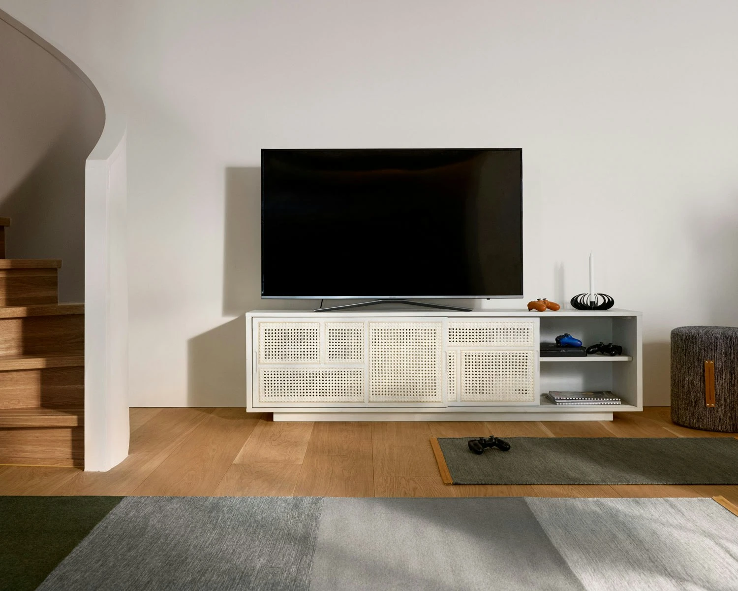 Het lage dressoir Air van Design House Stockholm is ontworpen door Mathieu Gustafsson, en past perfect als tv-meubel. De houten ribben op de schuifdeuren zorgen voor een grafisch patroon, dat een mooie aanvulling vormt op het lichte en transparante riet.