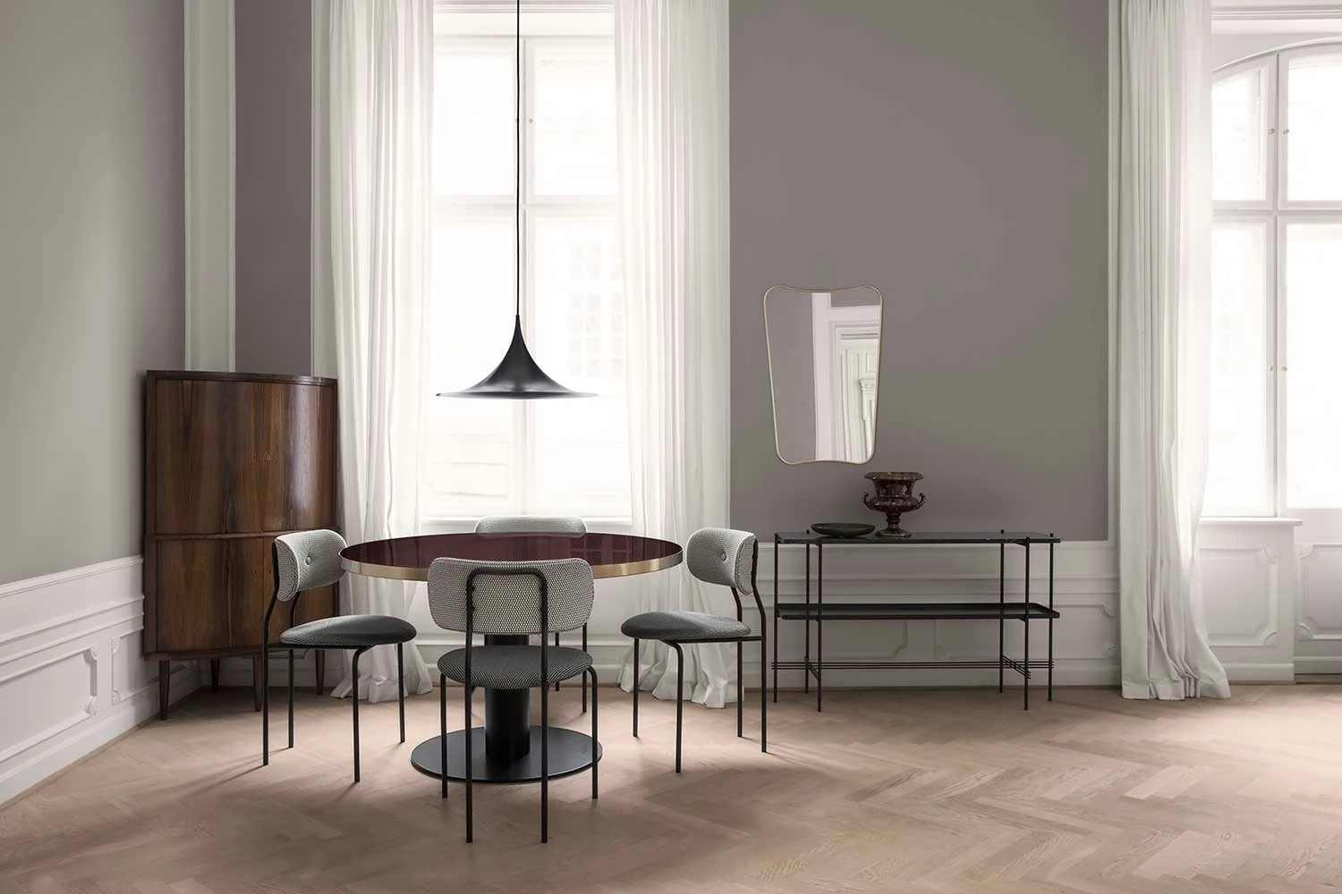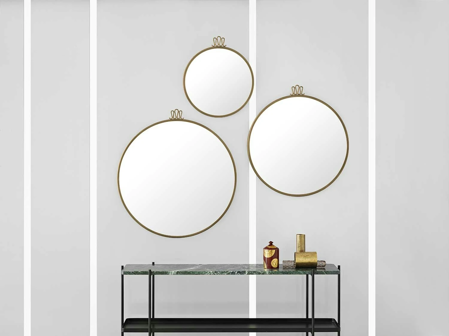 Ts Console 2, sideboard designed by GamFratesi for Gubi. Ts creates a sophisticated and sculptural aesthetics for any room with its characteristic slender legs, crossing details and contrasting solid table top of the most beautiful marble. The lower shelf is made of metal with edges for safe storage. Also available in a version with two marble shelves.