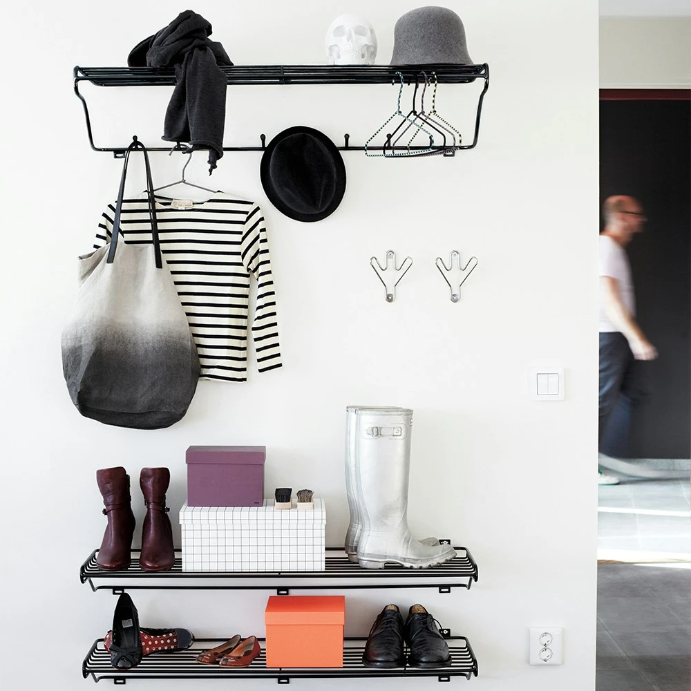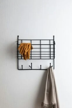 Hoedenrek Hat Rack, ontworpen door Olof Kolte voor Maze. Een stijlvolle hoedenrek gemaakt van milieuvriendelijk metaaldraad. Eenvoudig en praktisch in zijn soort en past gemakkelijk bij verschillende interieurstijlen. Met de zes haken heb je veel mogelijkheden voor het opbergen van kleding en accessoires. Verkrijgbaar in 2 maten. Dezelfde serie bevat ook een Mitten Shelf en Shoe Shelf.