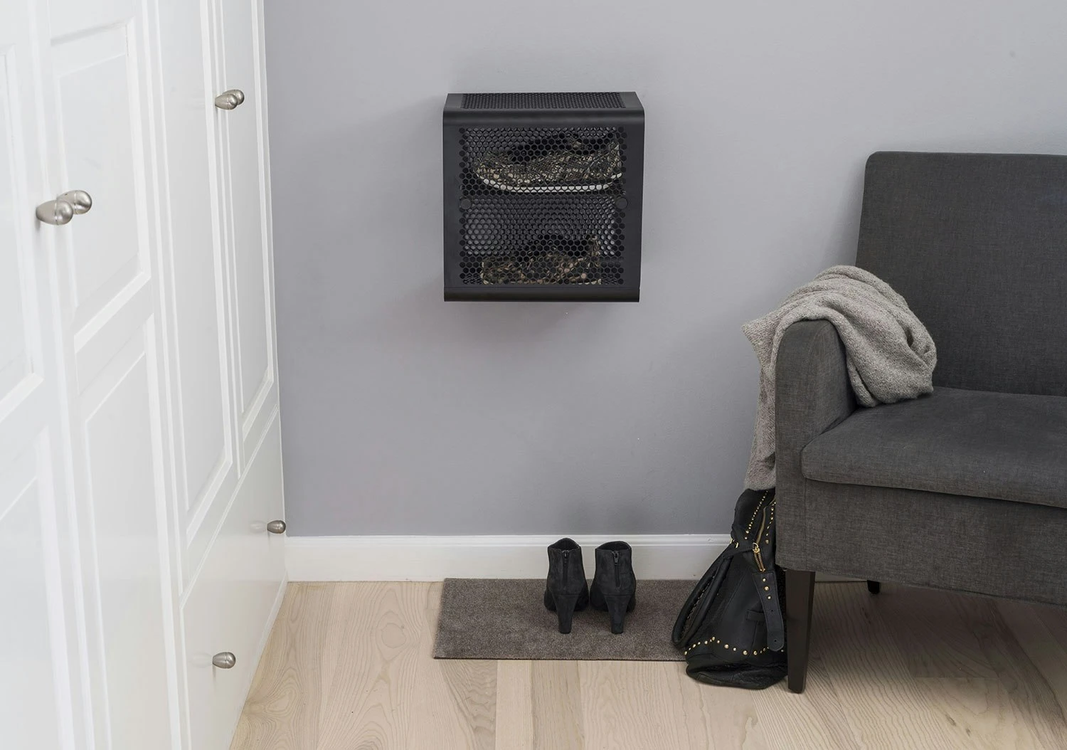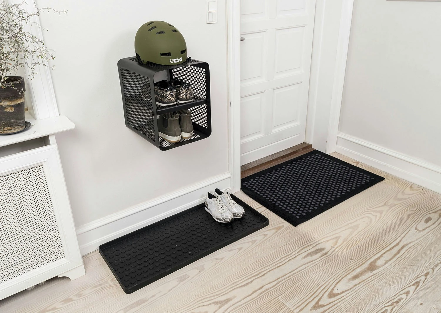 A practical and stylish shoe rack from Tica Copenhagen in metal with a nice pattern. The rack can be hung in two ways, either with the shelves forward or parallel to the wall, depending on your needs. Perfect for the hallway but can also be used in the bedroom, wardrobe or in the bathroom. The shelf metal sides can be used for keys, bicycle helmets or other items that can be hung with S-hooks. In order to prevent dirt and water from getting onto the shoes, we recommend that you supplement with a rug for shoe rack in 6-pack from the same brand.